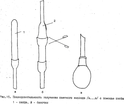 В данном случае во избежание растрескивания цветных колец их разогревают путем разогрева формы. Таким же образом можно получать вертикальные цветные полосы. При этом в форму в вертикальном положении вставляют отрезки цветных полос. Для спиралеобразного расположения на изделии цветных полос необходимо к дну пульки с вертикально расположенными полосами прилепить понтию и, вращая заготовку, превратить вертикальные полосы в спиральные. Затем пулька отбивается от понтии, разогревается,, место прилепа заглаживается и изделие выдувается в форме. Частичный наклад можно выполнить с применением пластинки цветного стекла или цапфы. Здесь возможно нанесение цветных кружков и пятен как по всей поверхности изделий, так и на небольших участках. Можно получать также цветной наклад на изделии под углом. Один из приемов получения такого наклада состоит в том, что из цветного стекла выдувают баночку, прокалывают ее шилом, расширяют отверстие и ножницами отрезают часть стекла под углом. Затем осуществляют набор бесцветного стекла и после оформления пульки выдувают изделие в форме. Для выработки изделий с постепенным ослаблением окраски снизу вверх на бесцветный набор снизу накладывают цветное стекло, при этом границу соприкосновения стекол можно сдвигать по внешней поверхности набора. После раздувания баночки на нее набирают бесцветное стекло, раздувают пульку, выдувают и оформляют готовое изделие. Для получения изделий с постепенным ослаблением окраски сверху вниз из набора цветного стекла изготовляю продутую баночку. На эту баночку набирают бесцветное стекло, раздувают пульку, выдувают и оформляют готовое изделие. Одним из способов получения частичного наклада является получение на изделиях акварельного пятна. В данном случае цветное пятно наносится с помощью тонкостенной, специально выдуваемой тонкостенной пульки. При этом происходит сплавление стенок бесцветной пульки со стенками цветной, Остальное цветное стекло, оставшееся на пульке, удаляется. Акварельное пятно на изделии может быть получено при нанесении цветного слоя как на баночку, так и на пульку.